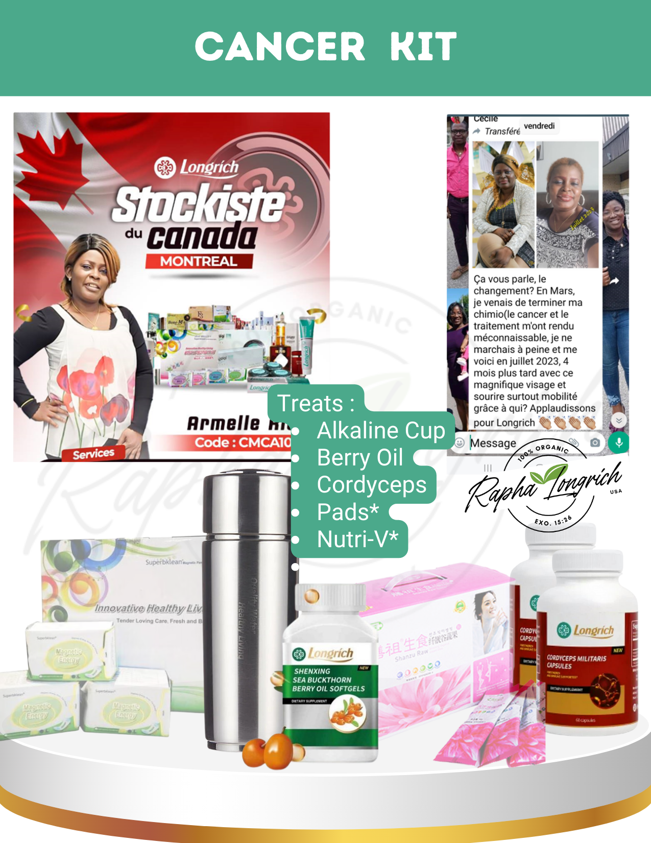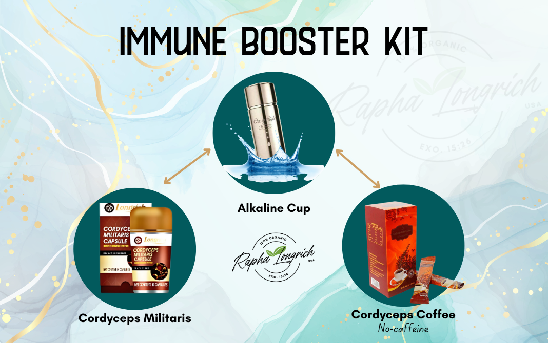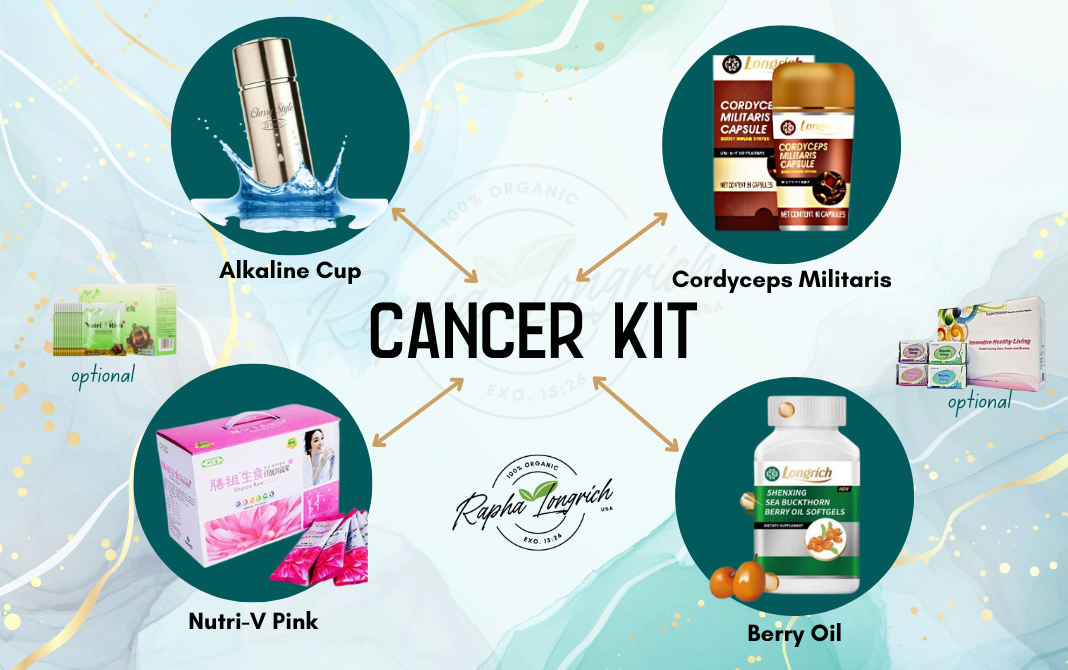 A supportive, holistic kit designed to complement conventional care with immune-enhancing and antioxidant-rich supplements. Includes Cordyceps capsules, Sea Buckthorn (Berry Oil), alkaline water, optional Nutri‑V herbal blend, and Superbklean feminine pads enhancement tools. Not a substitute for medical treatment—consult your doctor before use.